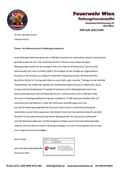 Uns haben viele Rettungshundeführer geschrieben welche ebenfalls IGP Ausbildung mit ihren Hunden betreiben, und wenn man weiß das Österreich zu den erfolgreichsten Rettungshundeorganisationen im Einsatz und Sport gehört, ist ein Verbot der Gebrauchshundeausbildung eine Gefahr für den Erhalt von wesenssicheren Hunden.